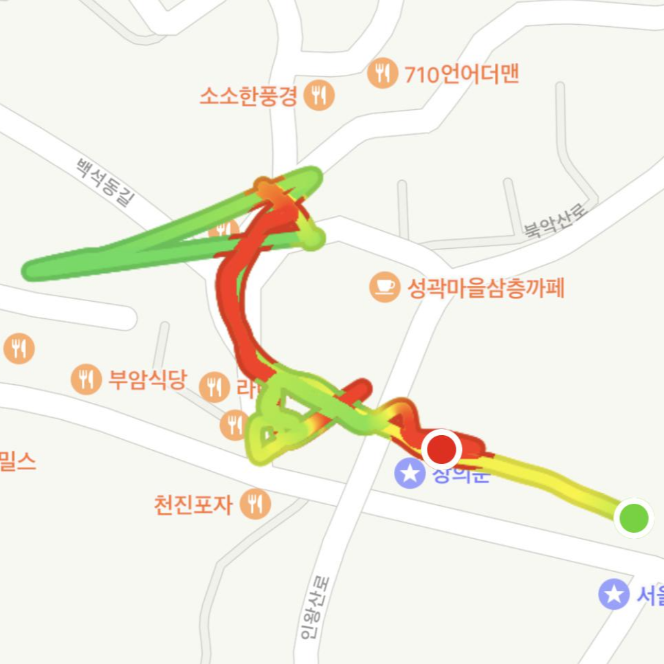 점심을 먹고 저희는 카페를 가기로 했어요. 날씨가 좋다 보니 서촌까지 걸어서 이동하여 카페를 찾아보기로 했습니다. 서촌 구경했던 글은 다음 포스팅에 이어서 작성하도록 할게요. 북악산과 부암동에 관한 이야기는 여기까지입니다. 단풍이 들고 하늘이 좀 더 청명하다면 더 멋진 뷰를 기대할 수 있을 테니, 이번 단풍 시즌에 맞춰 한 번 북악산 탐방로를 따라 곡장에 올라보시면 좋겠습니다! 1일 1포 스팅을 하려는 제 다짐을 지키기 위해 오늘은 이만 마치고 다음 글에서 뵙겠습니다. 모두 즐거운 연휴 보내세요!