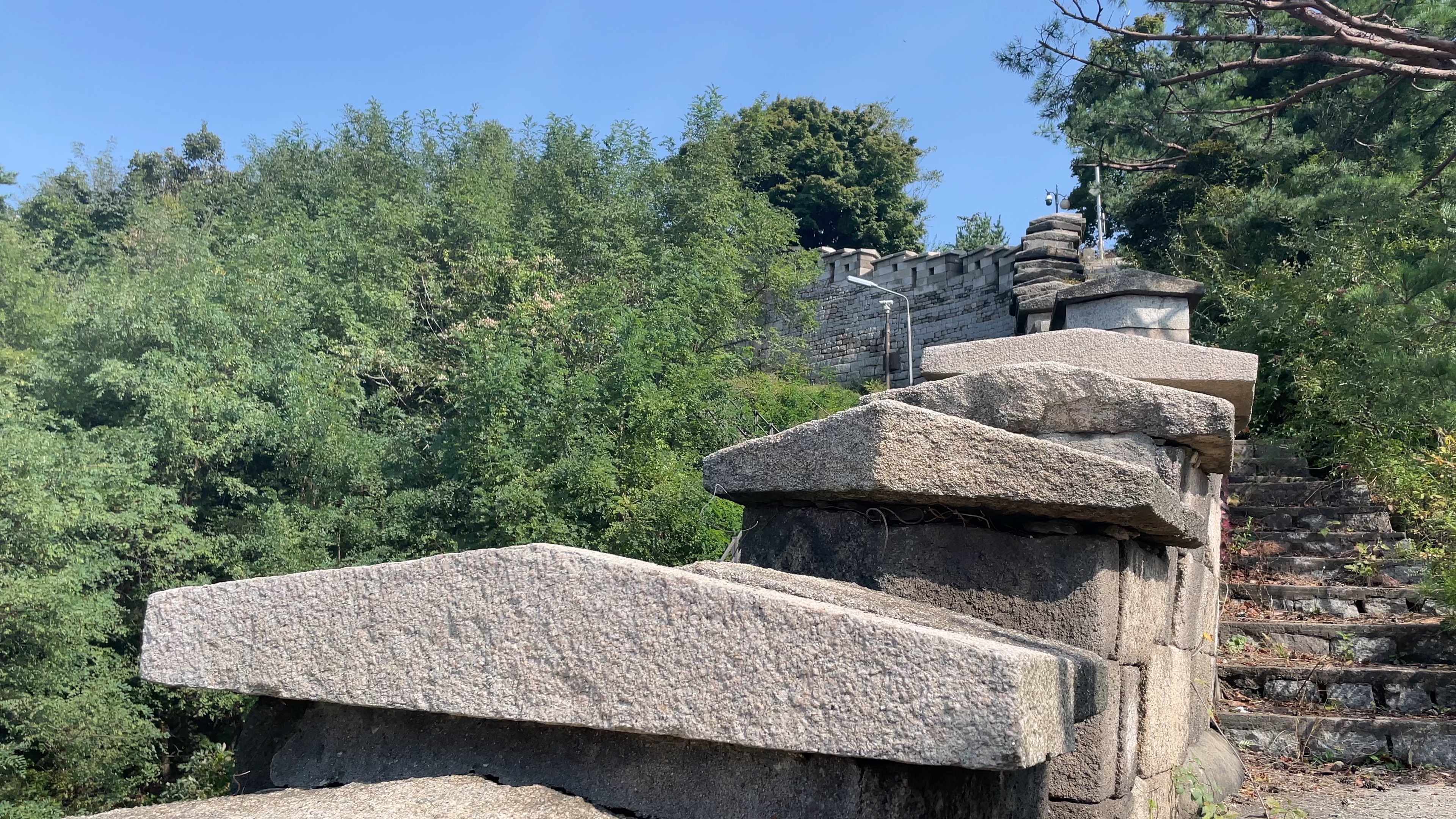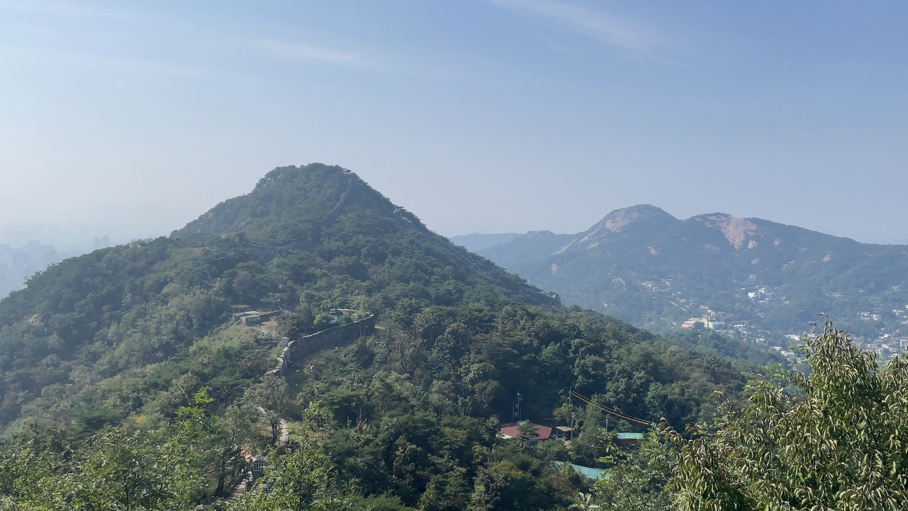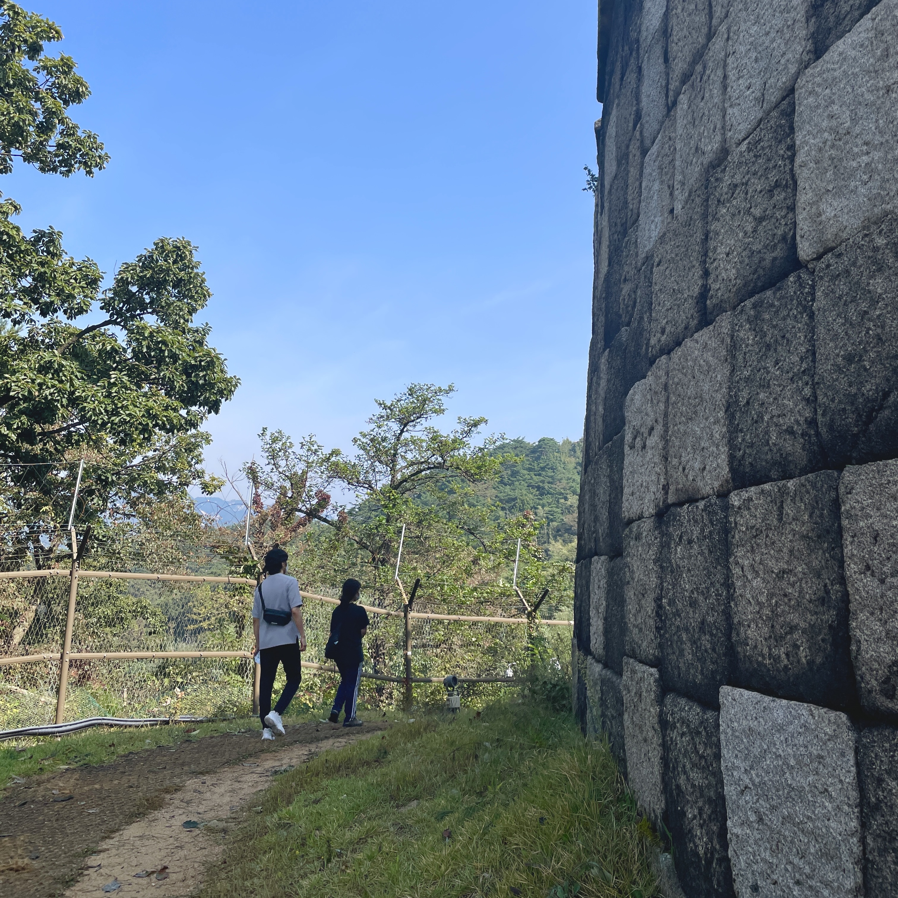 생각보다 날이 흐렸지만, 햇빛은 강렬하게 내리쬐고 있었습니다. 성곽에 올라오고 10분 정도면 곡장에 도착합니다. 날이 흐려도, 곡장에 올라서서 내려다본 경치는 나쁘지 않았어요. 올해가 늦여름의 여파로 단풍이 느리다고 하는데, 확실히 아직 단풍의 느낌이 없긴 합니다. 10월 말이 지나면 이곳의 색깔도 울긋불긋하게 변하지 않을까 싶네요. 한바탕 사진을 찍었지만, 저희의 사진은 저희만의 추억으로 간직할게요. (ㅎㅎ) 생각보다 높이도 많이 안 높아서 적당히 등산한 느낌으로 기분 좋게 곡성을 찍고 하산했습니다. :)