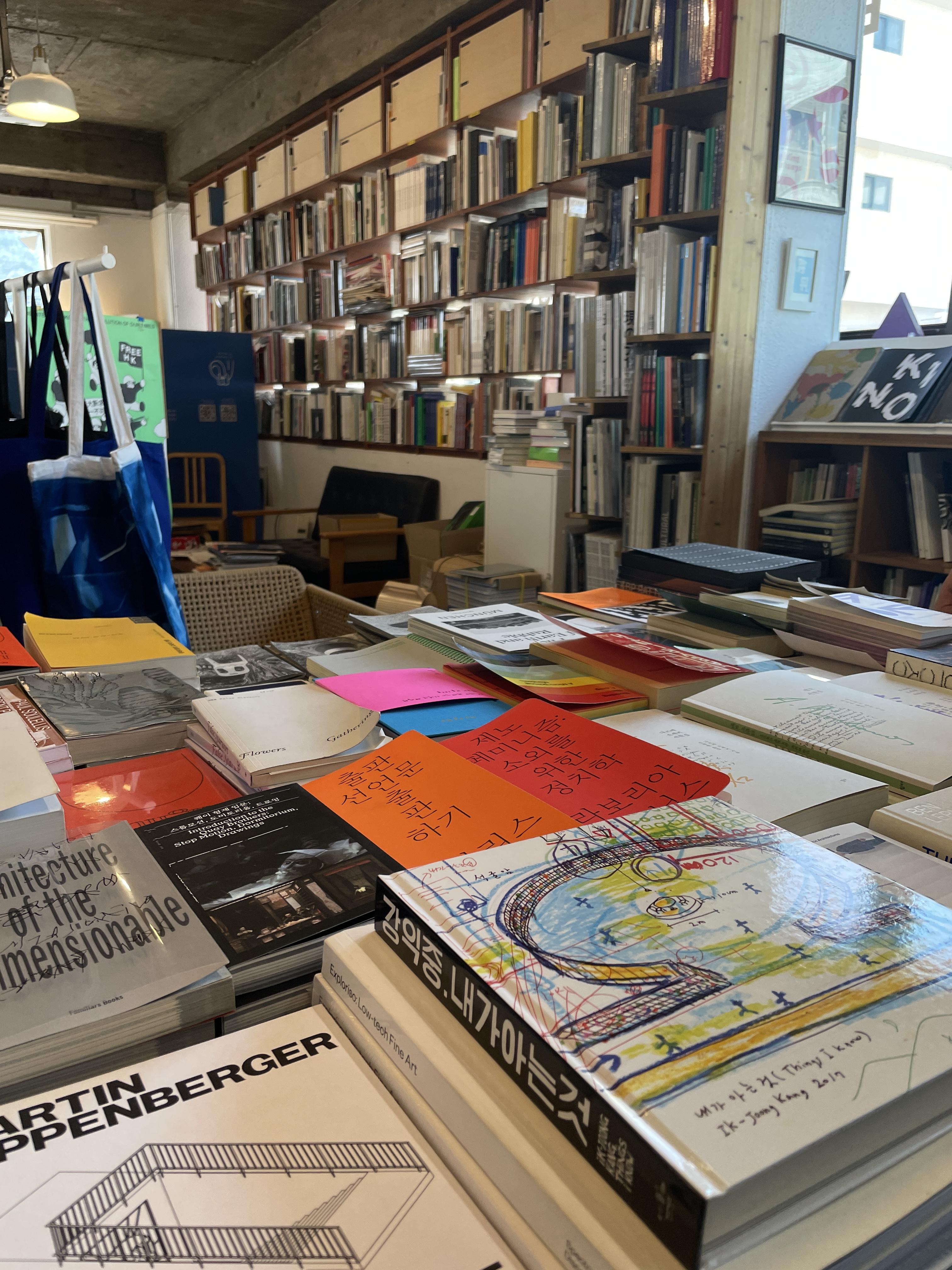 산도 갔다왔고, 카페도 갔다 왔으니 이제는 몸이 노곤 노곤해지는 느낌에 그만 집으로 가려던 찰나, 바로 맞은편의 책방에 동기들이 관심을 보여 한 번 올라가 보기로 했어요. 2층이었는데, 밖에서 봤을 때도 한 번쯤은 꼭 방문해보고 싶은 느낌을 풍기는 책방이었습니다.