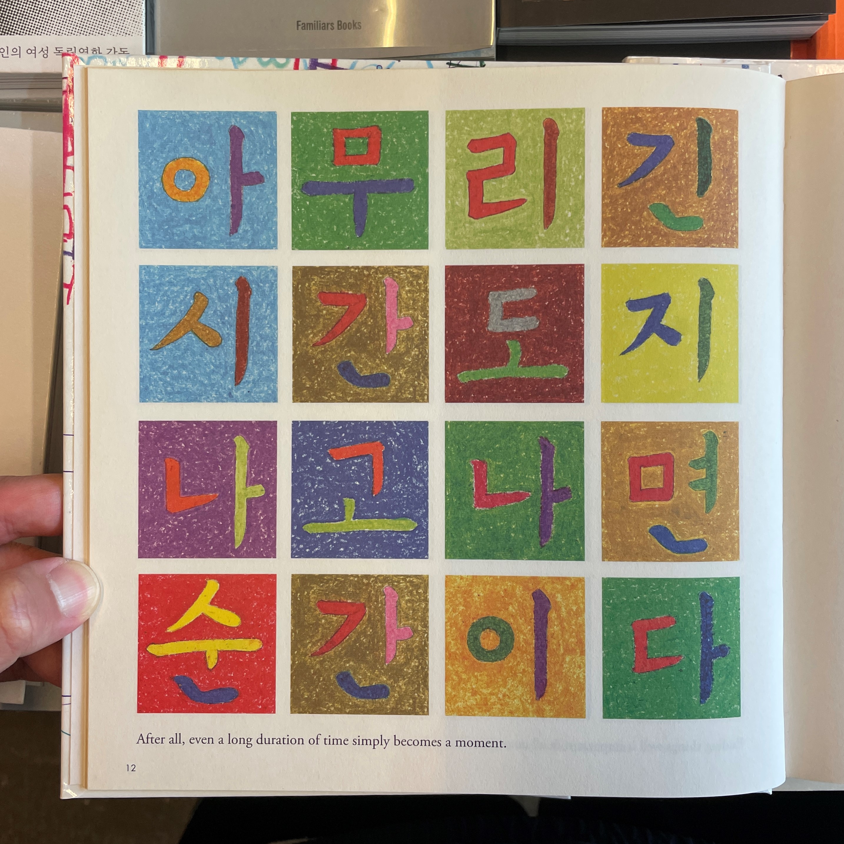 그중에서 시선을 끄는 책이 있었는데, 설치미술가로 활동 중인 강익중 님의 작품을 엮어 출간한 도서였어요. 배가 아프다는 내용이 있었나, 굉장히 가벼운 이야기부터 결코 그냥 웃어넘길 수 없는 진리가 담긴 글귀까지 담긴 색색의 한글작품을 만날 수 있었습니다. 사실 그전까지는 몰라 뵈었는데, 인터넷으로 다시 찾아보니 2018년에는 순천만 공원에서 한글작품으로 쌓아 올린 현충공원이라는 작품 활동까지 하셨더군요. 그러고 나니 이 책의 마지막에 그려져 있던 임진강의 다리 그림이 더욱 이해가 갔습니다. 그 그림은 남한과 북한을 가로지르는 임진강 사이에 한글작품으로 꾸며진 동그란 다리를 둔 그림이었어요. 그냥 그림이라기보다는 그래픽이었습니다. 실제로 실현이 되면 어떨까 싶을 정도로 실현된다면 정말 장관일 것 같고, 작가님께선 이를 '꿈의 다리'라고 명하셨더라고요. 순국선열과 통일염원까지 담은 한국적인 작품을 하신다는 데에서 그 의미가 아주 깊고, 신념이 보이는 작가라고 느껴집니다.