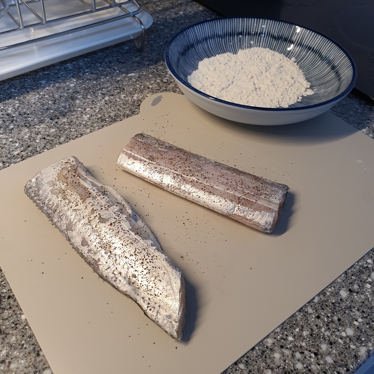 3. 10분 정도 간이 먹게 두고, 갈치에 부침가루를 입힌 후 살짝 털어서 튀김옷이 뭉치지 않게 합니다.