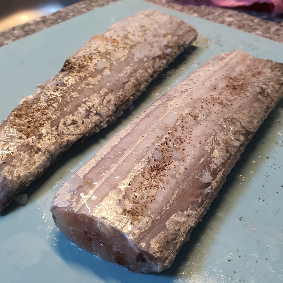 2. 해동 후에는 한 번 씻으면서 껍질을 정리해주고, 소금과 후추로 밑간을 해줍니다.