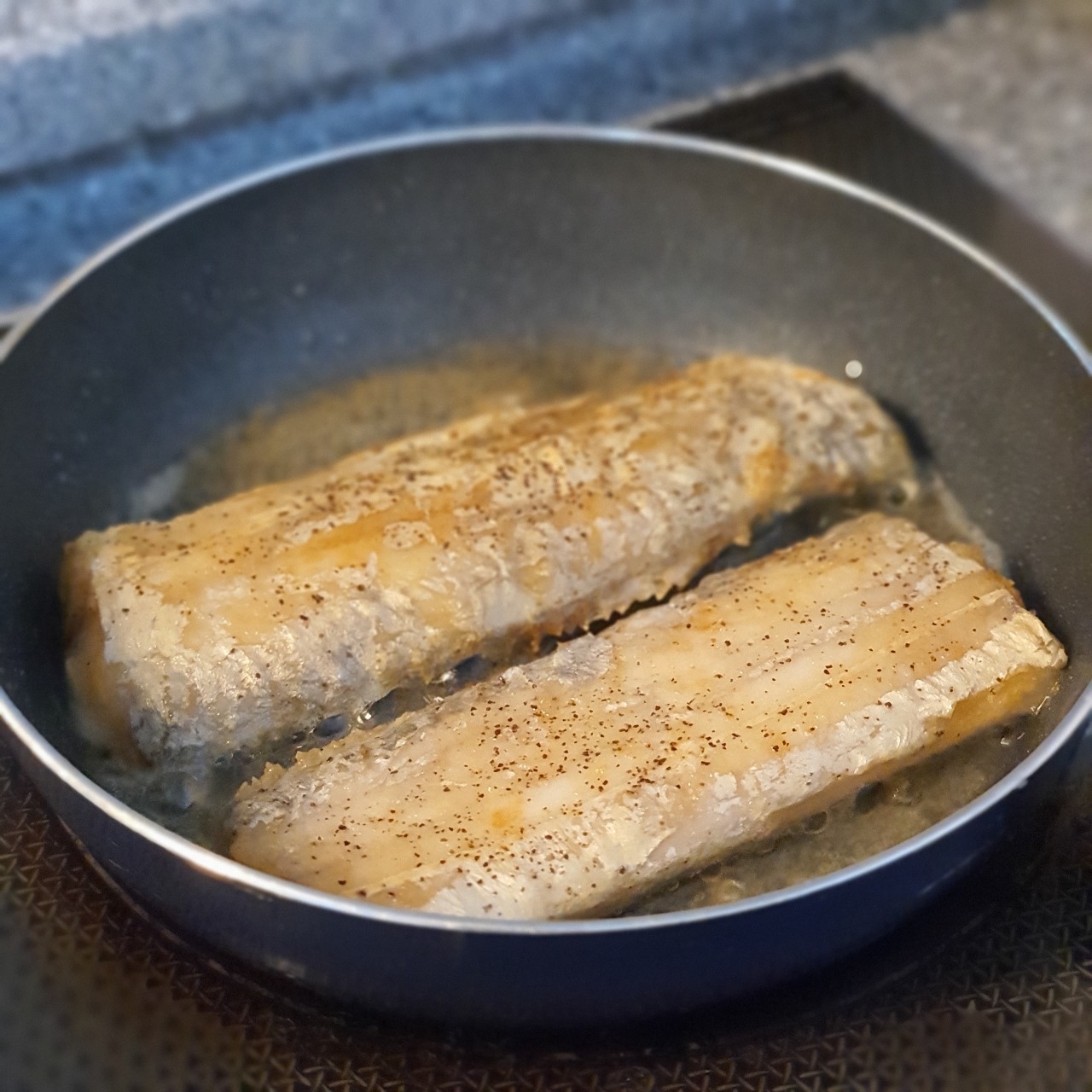 부침가루를 묻혀 식용유를 두른 프라이팬에 놓고 지글지글 구워줍니다. 튀김? 구이? 약간은 노릇노릇하게 튀긴다는 느낌으로 요리했어요. 이때 소리도 소리지만, 고소한 냄새가 정말 식욕을 자극한답니다. 자취방에는 치명적이지만 다시 찾고 싶은 마성의 고소함입니다. 제가 살고 있는 자취방은 '하이라이터'여서 단계가 0~9로 있는데, 8 정도에서 겉면을 익혀주고 5~6 정도로 낮춰서 잘 익혀주었어요. 사진으로 비주얼은 그닥이라고 느낄 순 있어도, 정말 다시 먹고 싶은 갈치구이입니다.