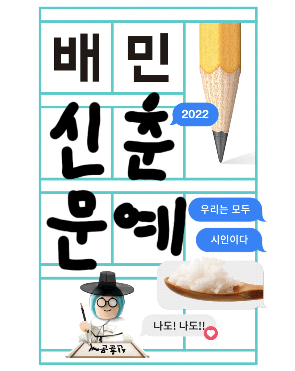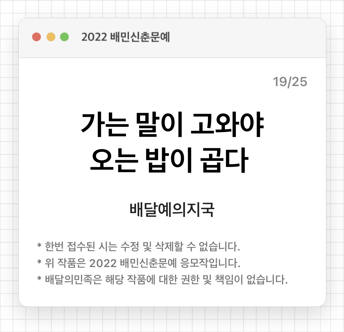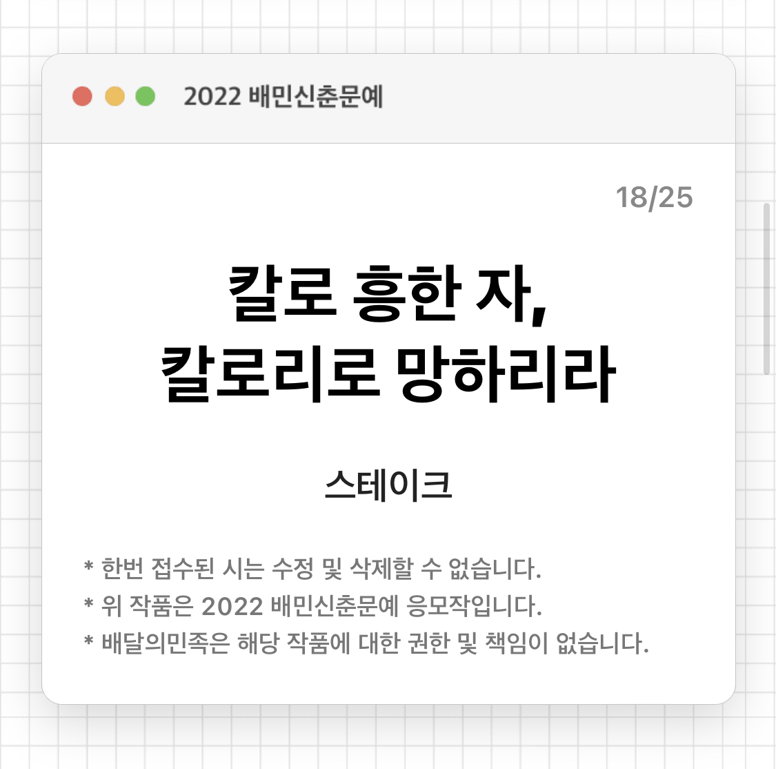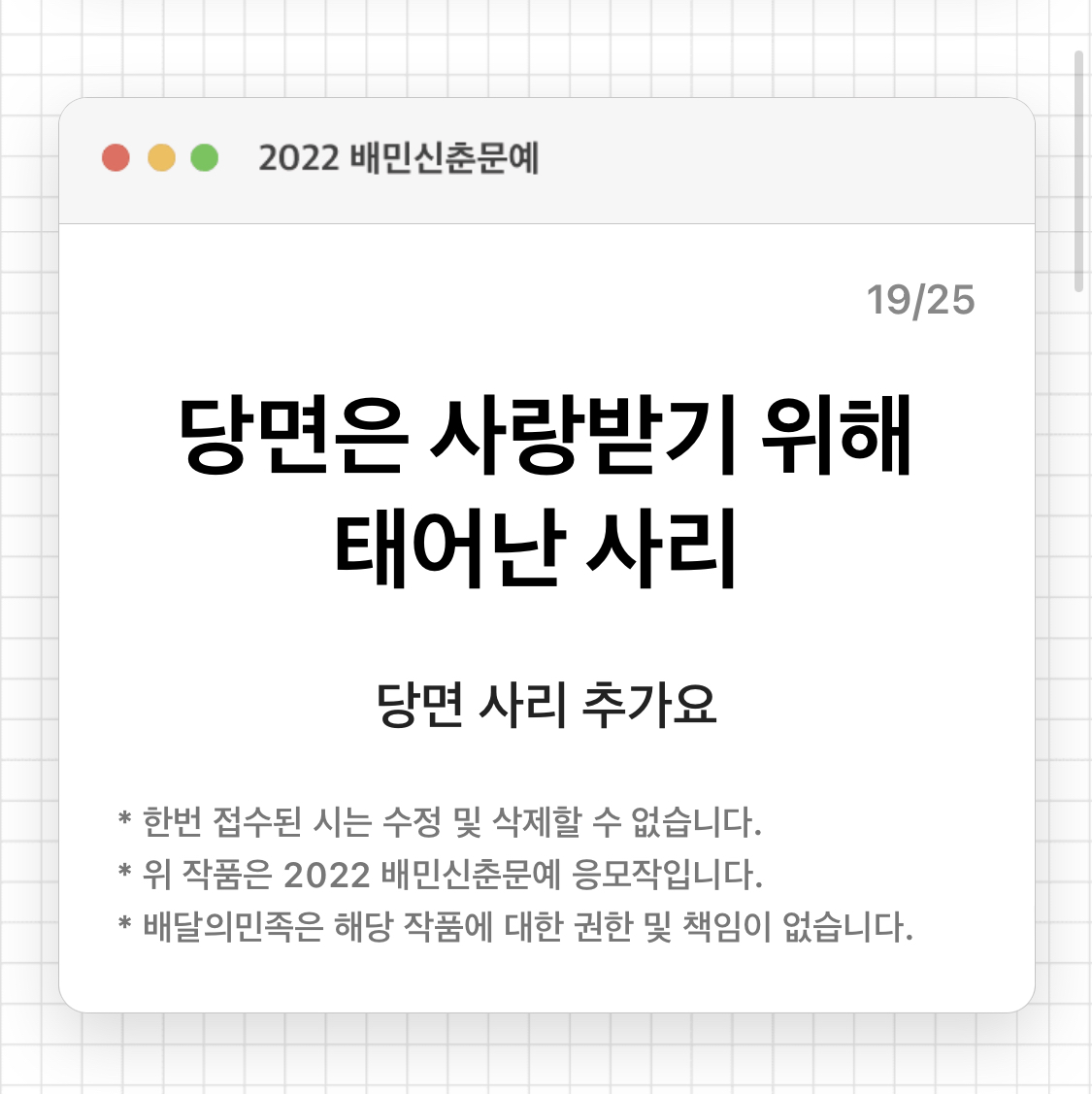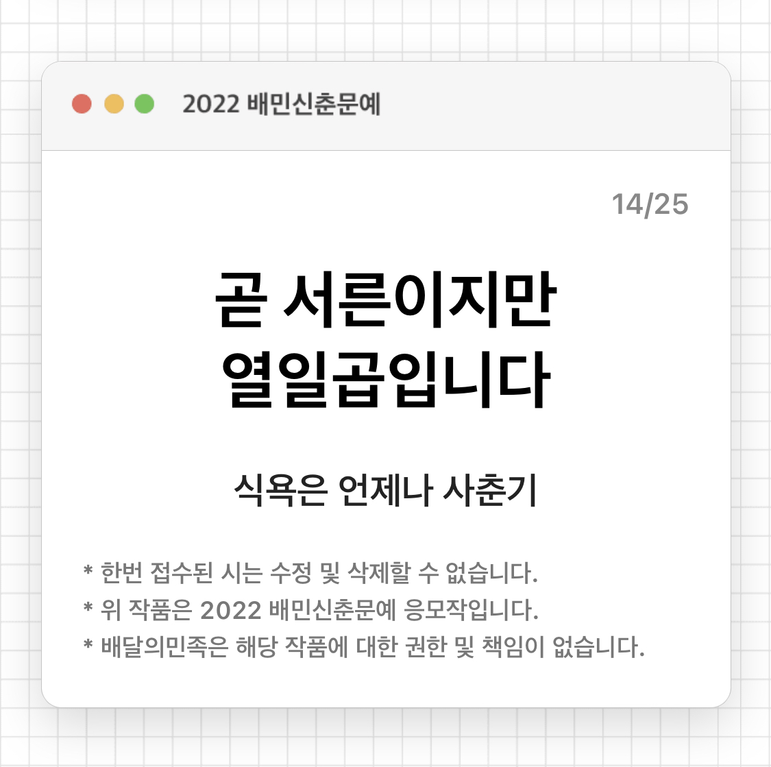 몇 해 전 지하철을 타면 보였던 웃긴 글, ‘치킨은 살 안 쪄, 살은 내가 쪄.’를 보고 ‘오, 괜찮은데?’라는 생각을 했었다. ‘근데 뭐지?’라는 생각이 들어서 광고를 자세히 살펴보니 배달의민족에서 여는 ‘배민신춘문예’ 당선작이었다. 이런 기발한 생각은 따로 하는 사람이 있겠지,라고 도전하지 않던 나에게 얼마 전부터 계속 한 배너광고가 눈에 들어왔다. 바로 배민신춘문예가 3년 만에 돌아왔다는 광고였다. 게다가 ‘우리는 모두 시인이다’라고 하니 몇 가지 좀 메모에 적어보았다. 근데 생각보다는 괜찮게 하는 것 같아서 제출까지 해보려고 한다. 바쁜 일상에서 휴식 같은 대회인 셈. 여러분도 많이 도전해보길 바란다.
