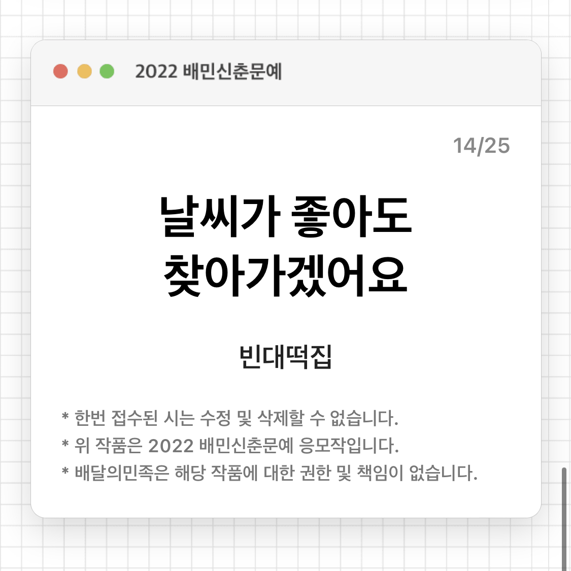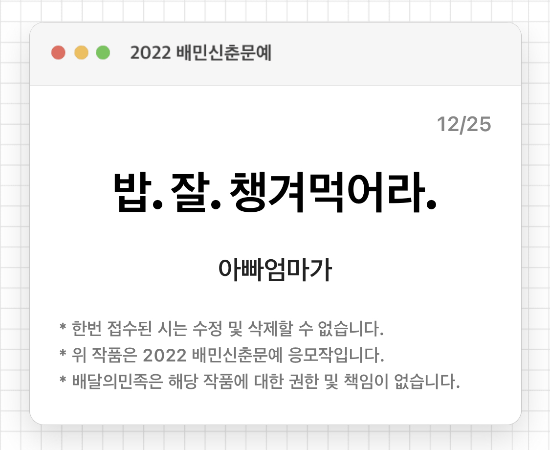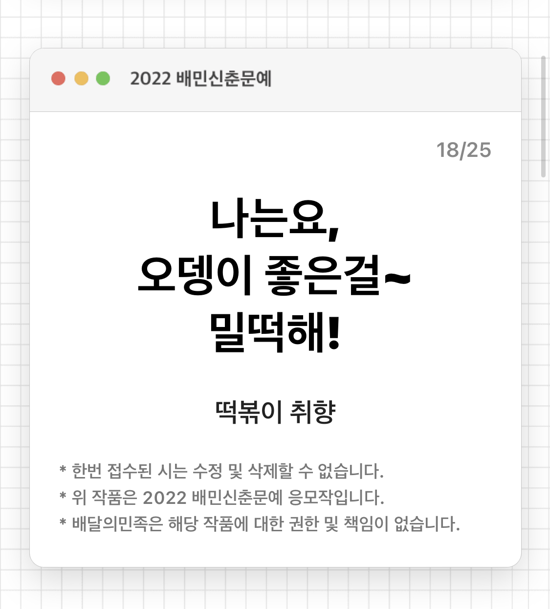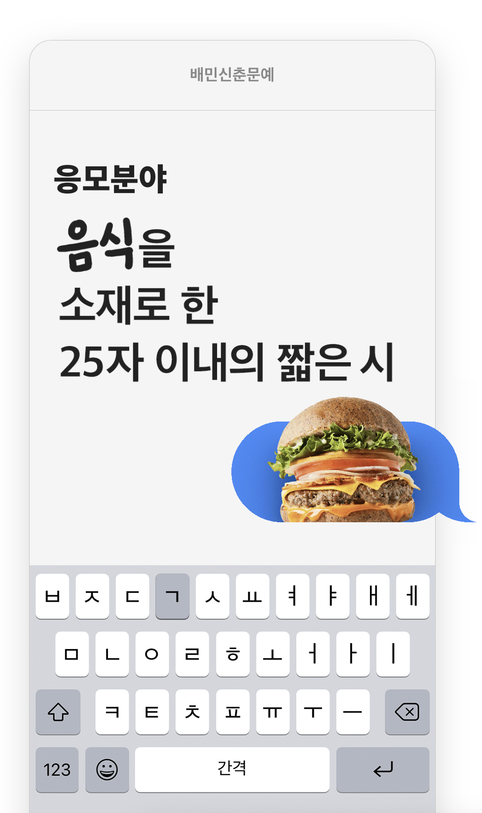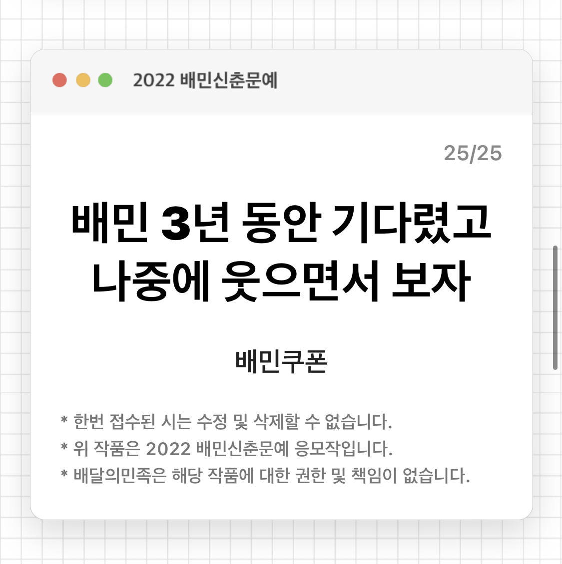 몇 해 전 지하철을 타면 보였던 웃긴 글, ‘치킨은 살 안 쪄, 살은 내가 쪄.’를 보고 ‘오, 괜찮은데?’라는 생각을 했었다. ‘근데 뭐지?’라는 생각이 들어서 광고를 자세히 살펴보니 배달의민족에서 여는 ‘배민신춘문예’ 당선작이었다. 이런 기발한 생각은 따로 하는 사람이 있겠지,라고 도전하지 않던 나에게 얼마 전부터 계속 한 배너광고가 눈에 들어왔다. 바로 배민신춘문예가 3년 만에 돌아왔다는 광고였다. 게다가 ‘우리는 모두 시인이다’라고 하니 몇 가지 좀 메모에 적어보았다. 근데 생각보다는 괜찮게 하는 것 같아서 제출까지 해보려고 한다. 바쁜 일상에서 휴식 같은 대회인 셈. 여러분도 많이 도전해보길 바란다.