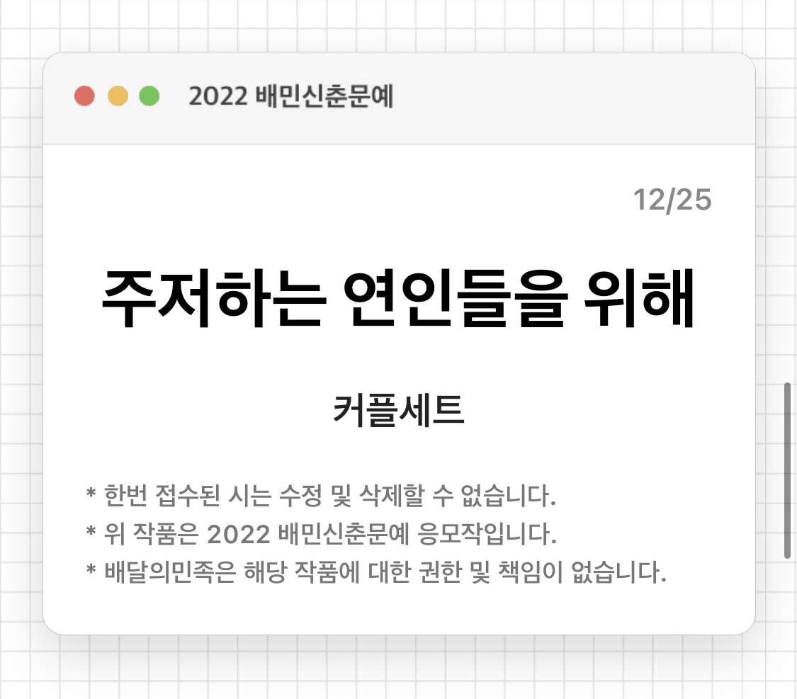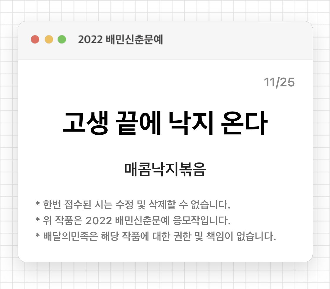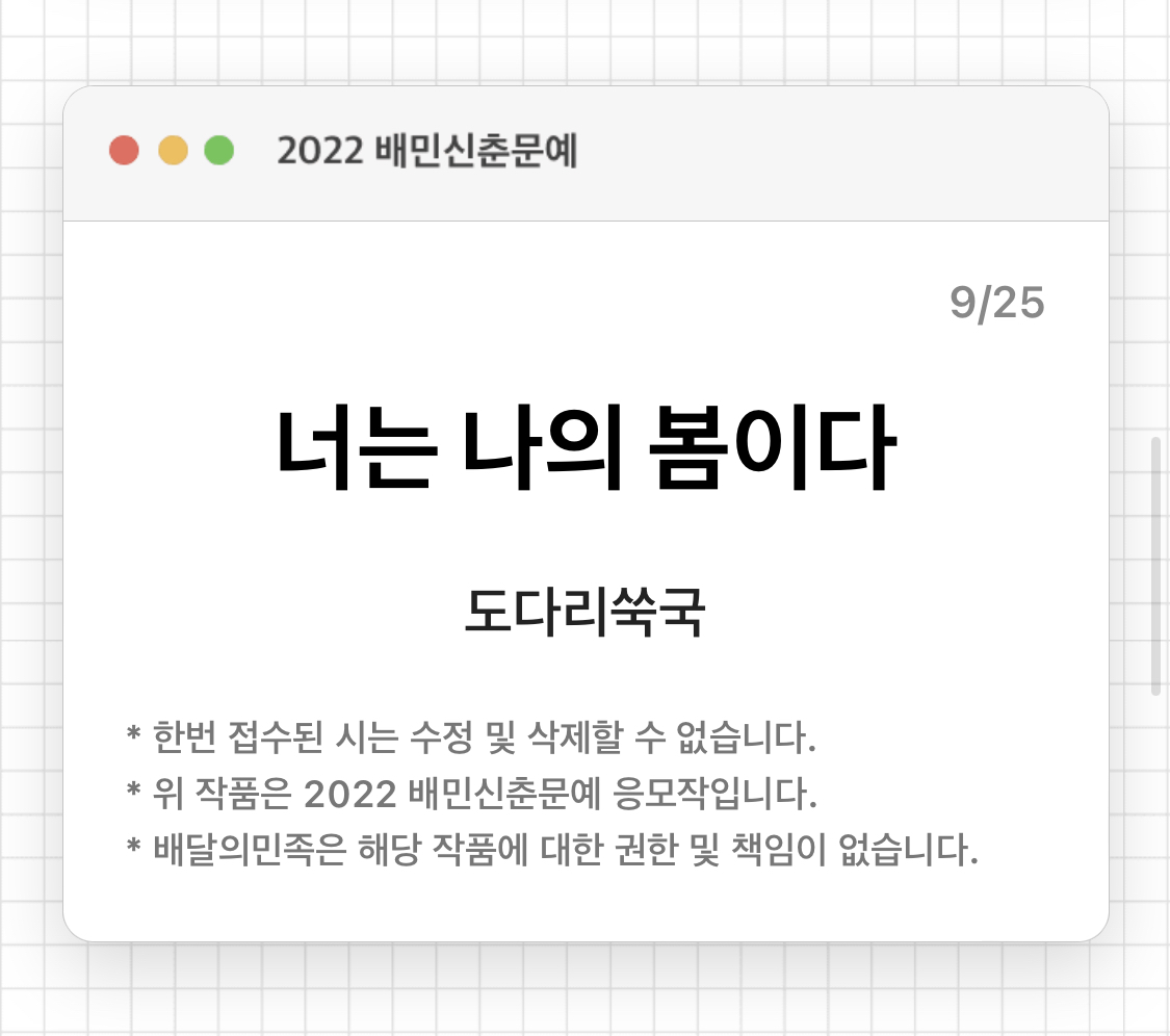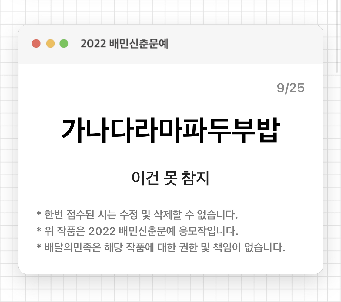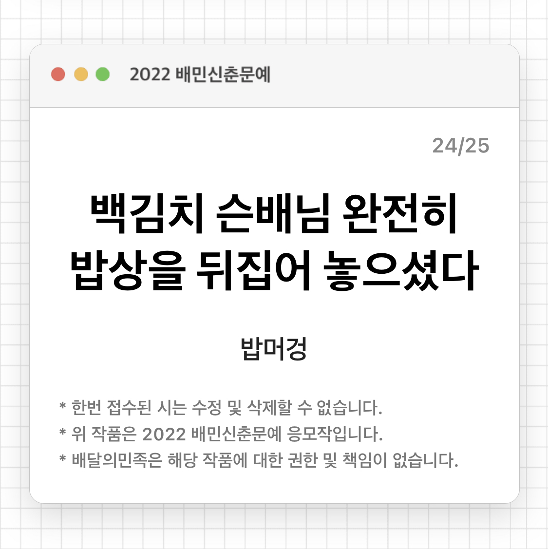 몇 해 전 지하철을 타면 보였던 웃긴 글, ‘치킨은 살 안 쪄, 살은 내가 쪄.’를 보고 ‘오, 괜찮은데?’라는 생각을 했었다. ‘근데 뭐지?’라는 생각이 들어서 광고를 자세히 살펴보니 배달의민족에서 여는 ‘배민신춘문예’ 당선작이었다. 이런 기발한 생각은 따로 하는 사람이 있겠지,라고 도전하지 않던 나에게 얼마 전부터 계속 한 배너광고가 눈에 들어왔다. 바로 배민신춘문예가 3년 만에 돌아왔다는 광고였다. 게다가 ‘우리는 모두 시인이다’라고 하니 몇 가지 좀 메모에 적어보았다. 근데 생각보다는 괜찮게 하는 것 같아서 제출까지 해보려고 한다. 바쁜 일상에서 휴식 같은 대회인 셈. 여러분도 많이 도전해보길 바란다.