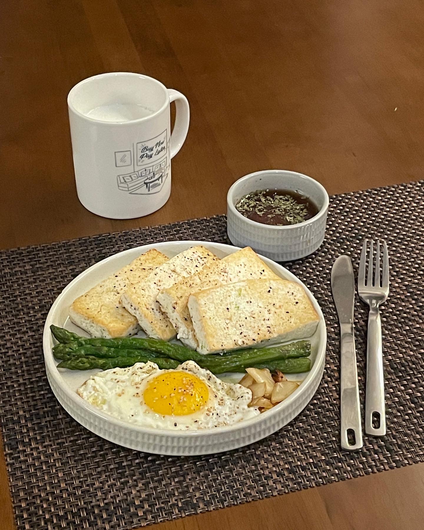 #저녁 - 아스파라거스 3개, 마늘 3쪽, 두부 2/3모, 써니사이드업, 우유 한 잔과 두부 간장 : 교정해도 뭔가 맛나고 폼나게 먹고 싶은 생각, 그래서 코치님이 추천해준 아스파라거스를 사서 삶은 다음에 살짝 기름에 튀겨줬어요. 두부와 마늘, 계란도 올리브유에 마찬가지로 해줬고요. 굉장히 건강한 맛이지만, 그 나름의 맛이 잘 느껴지는 좋은 식사였습니다 :)