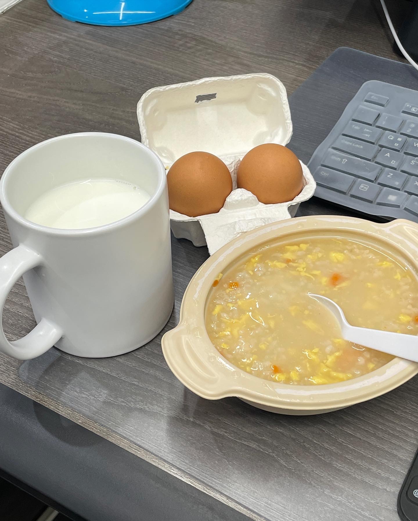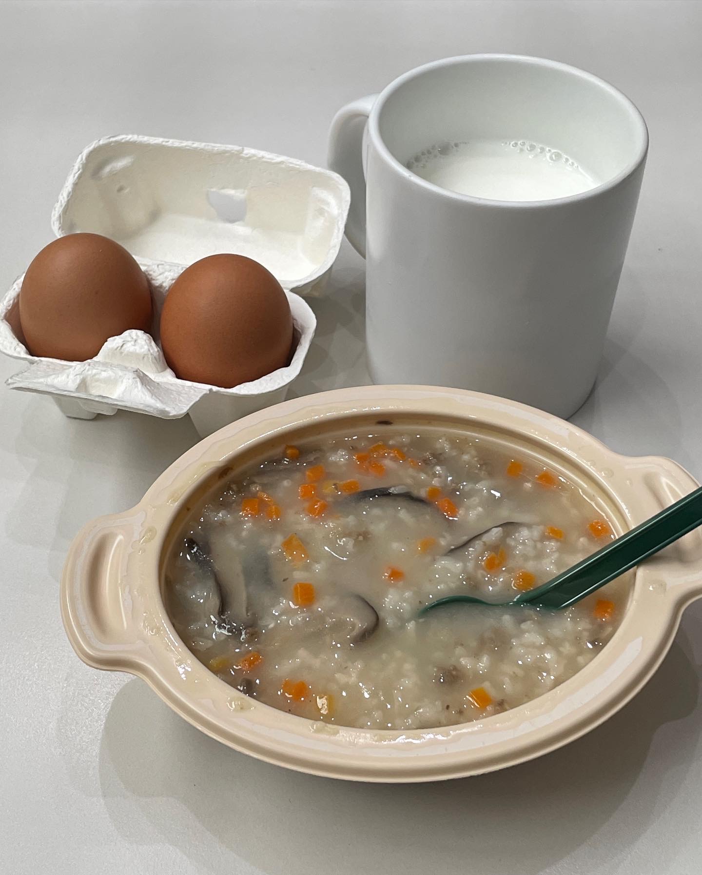 #점심 - 뚜레쥬르 새우계란죽, 반숙란 2개, 우유 한 잔 : 뚜레쥬르에는 소고기죽, 새우계란죽, 단호박죽이 있습니다. 개인적으로는 새우계란죽이 제일 나은 것 같아요. (건더기, 맛 등) 반숙란은 뭐, 1등입니다.