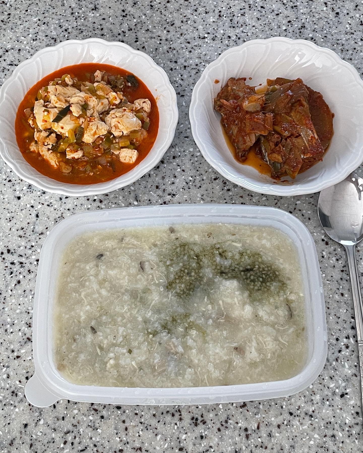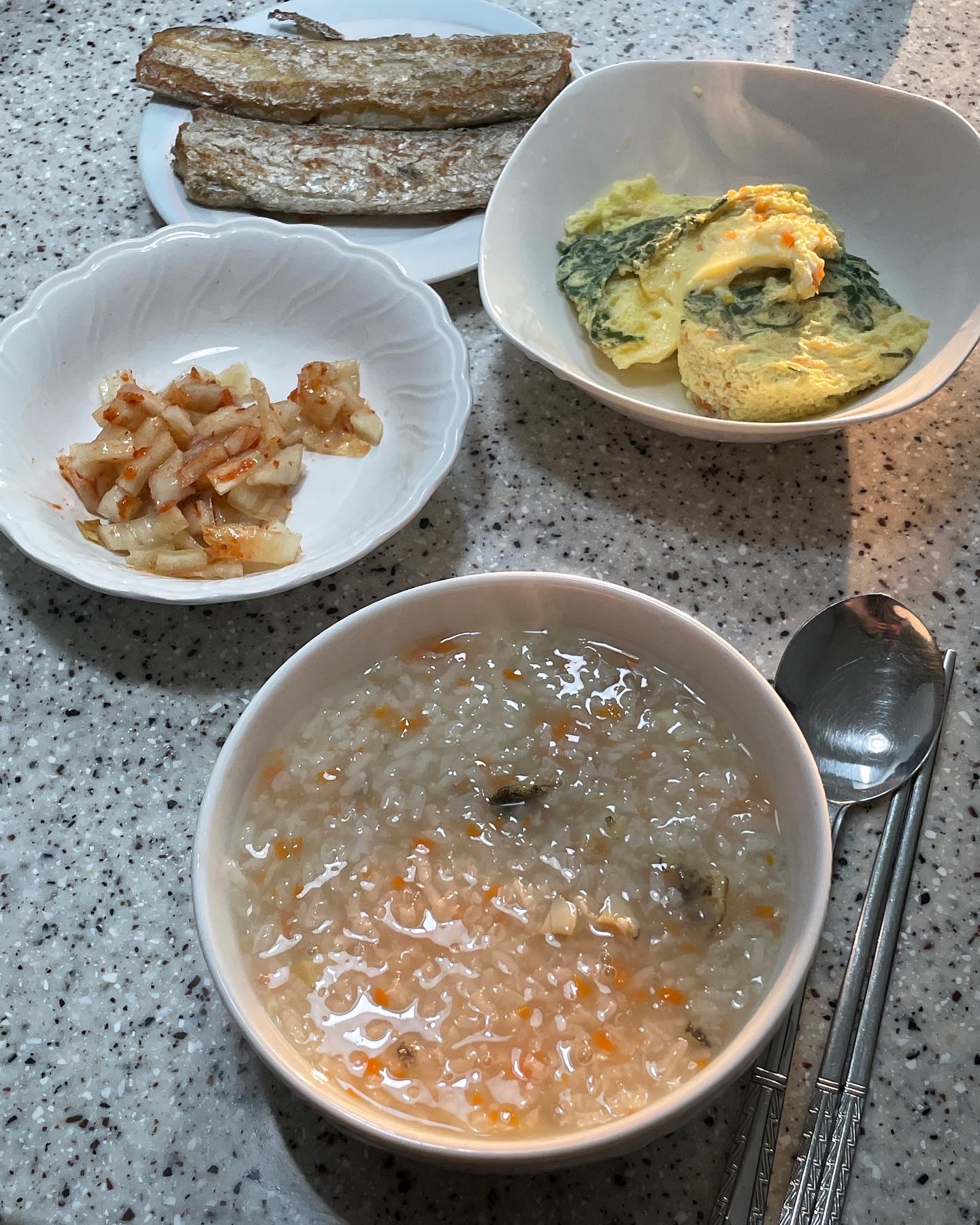 #저녁 - 또다시 전복죽, 계란찜, 다진 김치, 갈치구이 : 갈치구이는 진짜, 진짜 정답입니다. 맛있는 데다가 포슬포슬해서 교정 중에서도 특이 상황인 제게 거의 선물 같은 메뉴입니다. 심지어 코치님도 괜찮다고 하시니 뭔가 한 끼를 잘 마친 뿌듯함이 느껴진 식단... thanks to mom