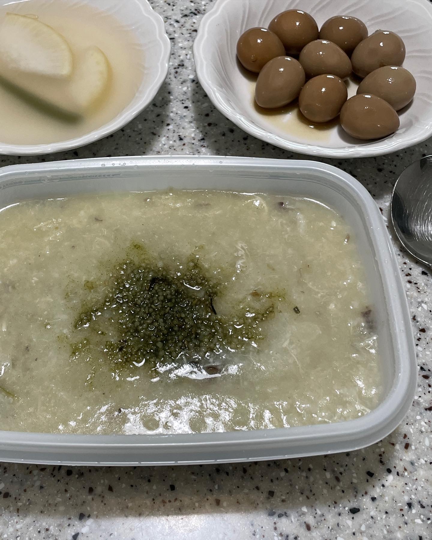 #점심 - 뽕잎닭죽 500g, 메추리알조림 9개, 물김치 한 접시 : 본가에 가는 길에 사간 닭죽, 뽕잎이라는데 딱히 그런 건 못 느끼겠고 나쁘지 않은 닭죽 맛이었습니다. 엄마의 반찬들 덕분에 더 잘 먹은 듯한 점심 :)