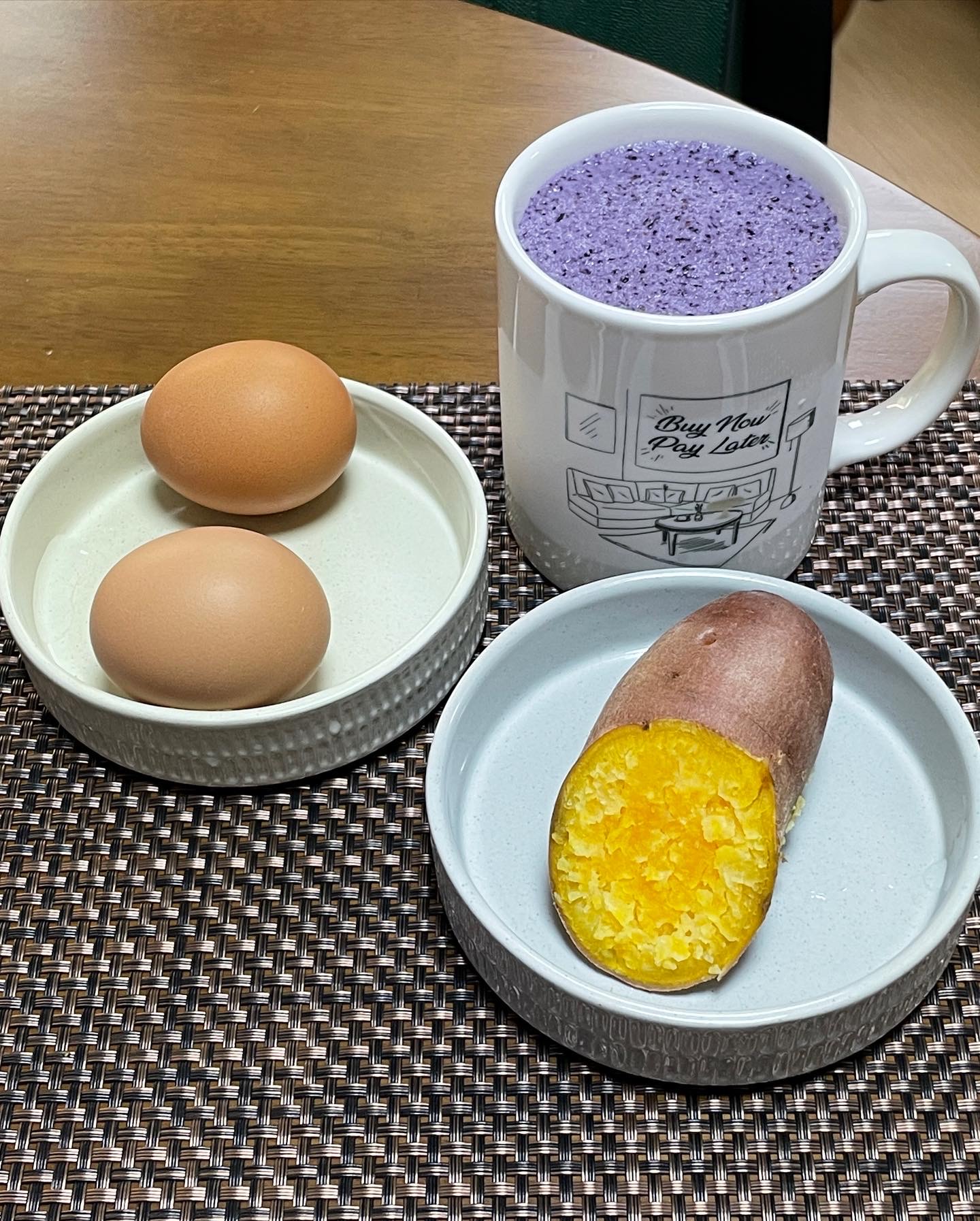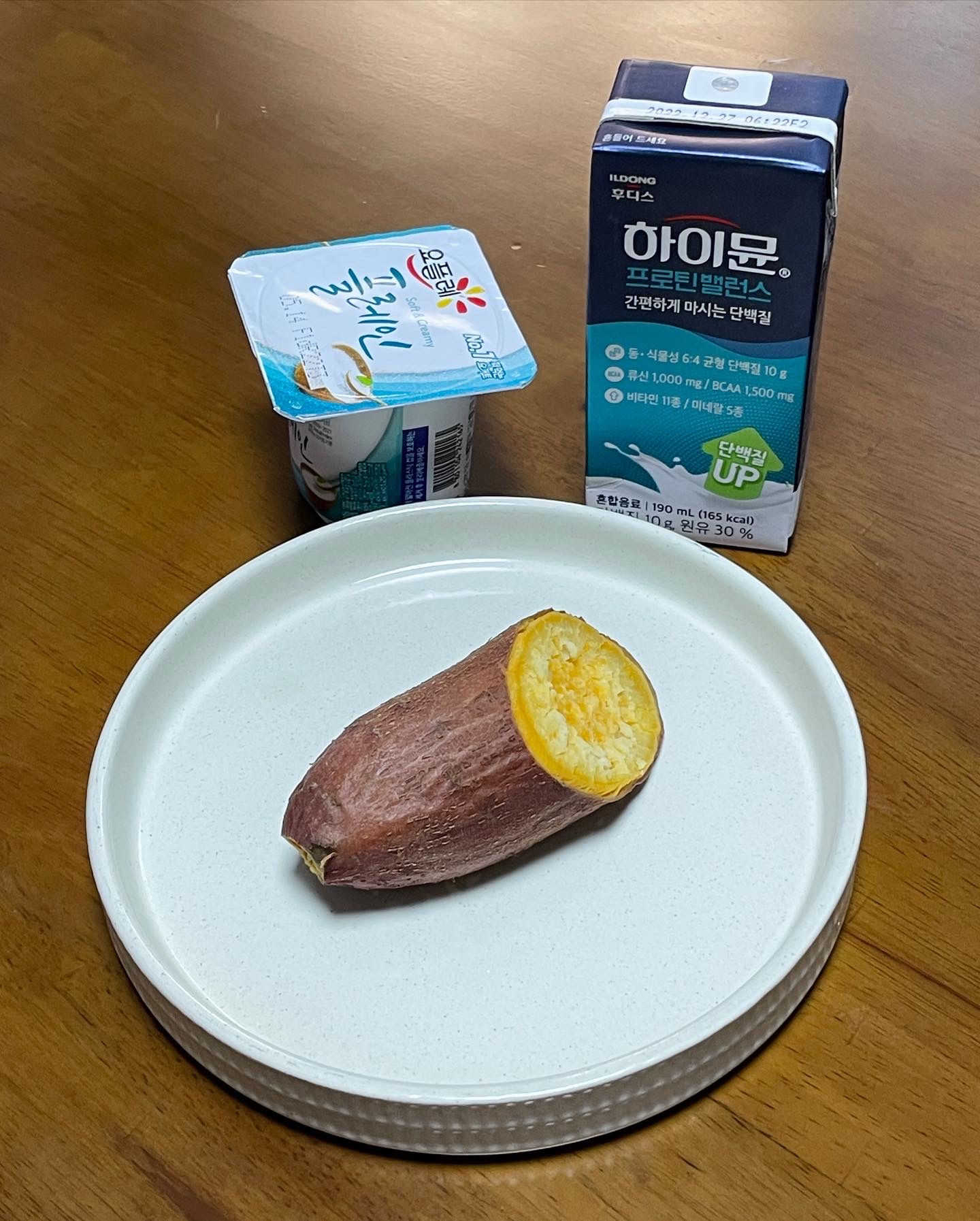 #아침 - 찐 고구마 반쪽 1개, 삶은 계란 1개, 하이뮨 프로틴 음료 1개 : 원래 잘 안 먹지만, 이제는 강제로라도 먹어보기로 했습니다. 영양소를 균형 있게, 시간 분배해서 먹는 게 좋다고 하니까요. 그래서 선택한 찐 고구마와 삶은 계란! 아마 저녁에 해두고 아침에 간편히 먹기 좋아서 자주 먹게 될 것 같았어요. (실제로 그러함) 이런 새로운 활동 덕분에 아침이 살짝 바빠졌고, 그래서 저의 기상 시간은 30분이 더 빨라졌습니다. 그렇다고 일찍 잠드는 편은 아닌데 말이죠, 그렇다고 엄청 피곤하지도 않아요. 신기하죠?