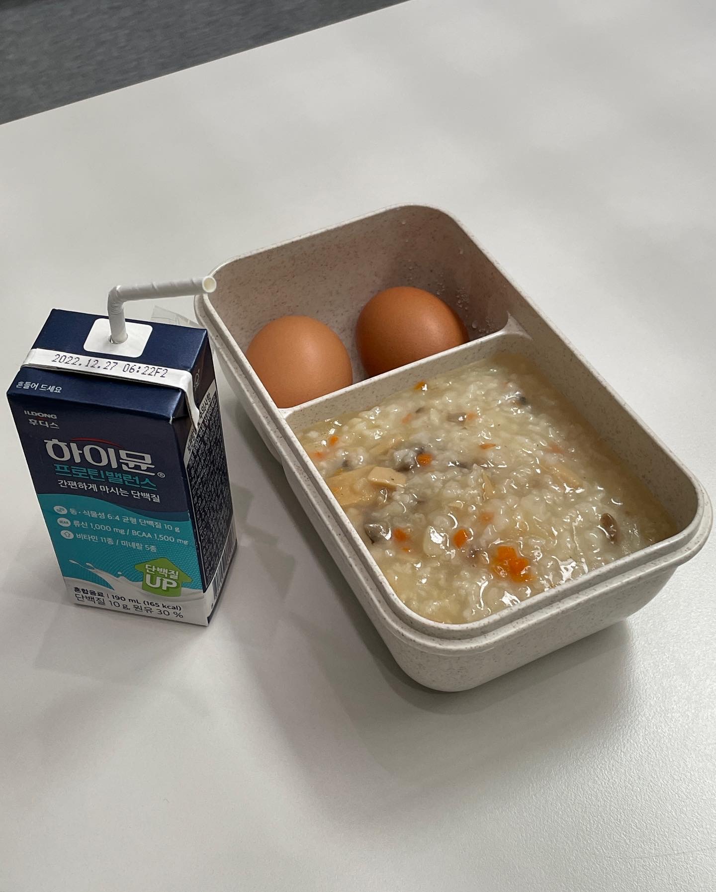 #점심 - 집에서 싸간 비비고 버섯야채죽, 삶은 달걀 2개, 하이뮨 프로틴음료 : 비비고죽이 생각보다 정말 괜찮은데, 양도 그렇고 맛도 좋습니다. 누군가 아플 때 급하게 죽을 하거나 죽집을 알아보곤 하는데, 그냥 마트에서 비비고죽 사서 뚝딱 데우면 그게 만찬이에요. 버섯야채죽도 좋은데 저는 개인적으로 녹두닭죽 추천드립니다.