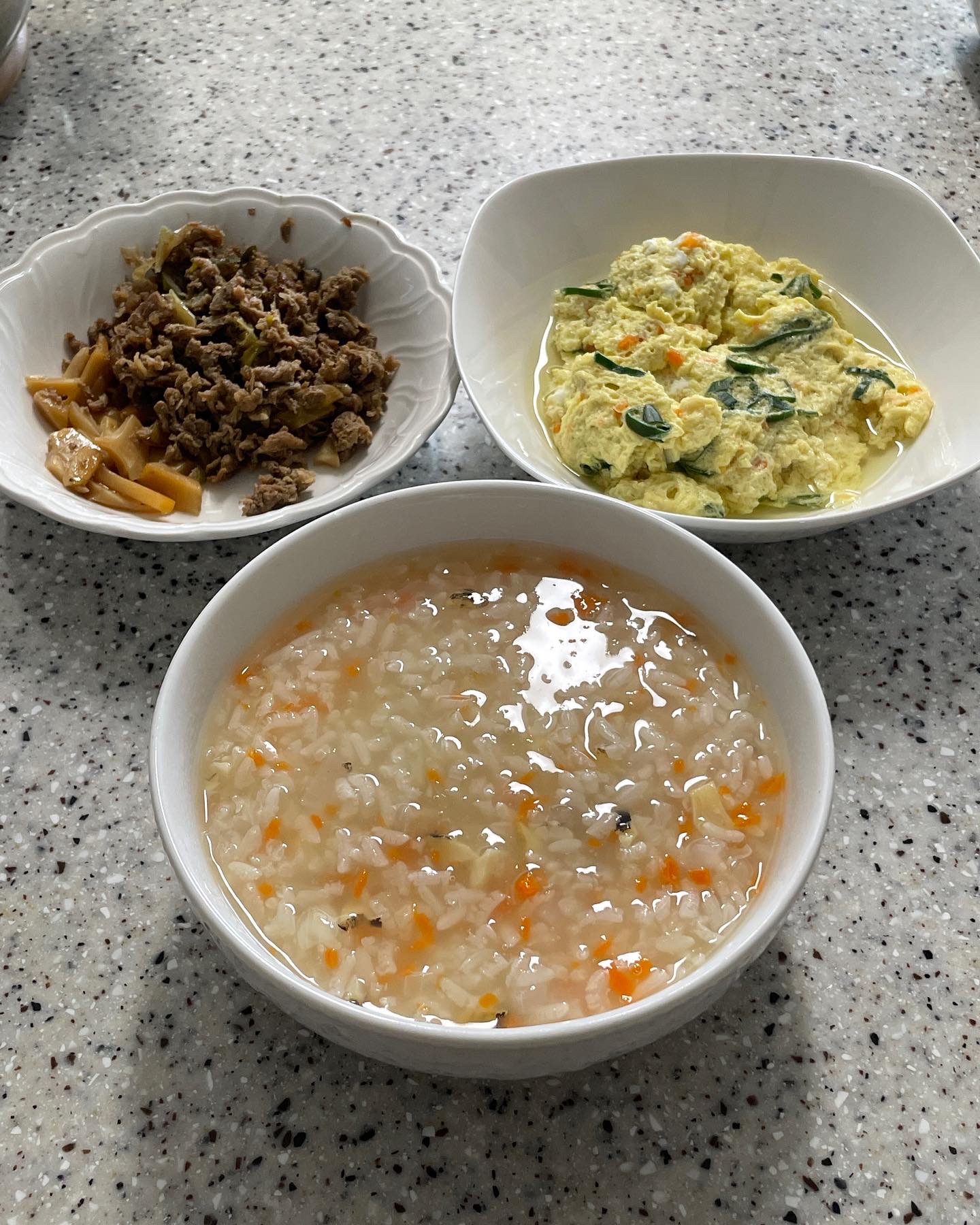 #점심 - 소불고기 다진 것 한 접시, 계란찜, 전복죽 : 코치님이 물릴 텐데 열심히 잘 먹는 거 보고 웃으신 식단입니다. 어쨌든 생각해서 차려주시니까 나름 열심히 먹은 식단, 그래도 충분히 배불리 먹었네요 :)