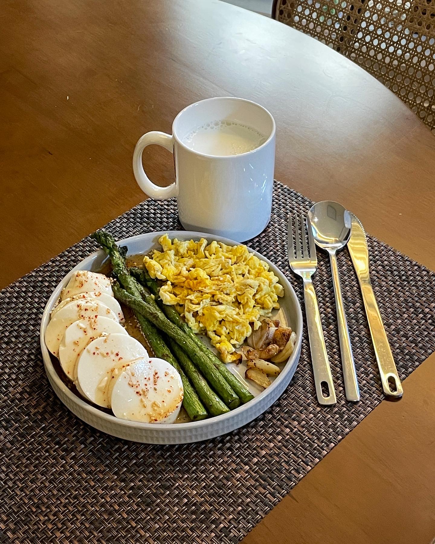#저녁 - 아스파라거스 4개, 마늘 3쪽, 계란 2개 분량의 스크램블에그, 순두부 1/2개, 우유 한 잔 : 저번 저녁처럼 뭔가 나이프가 필요해 보이면서도 아닌 것 같은 분위기 있고 영양소도 채워진 식단입니다. 코치님 덕에 아스파라거스에 눈도 뜨고, 맛있고 건강하게 채운 한 끼입니다.