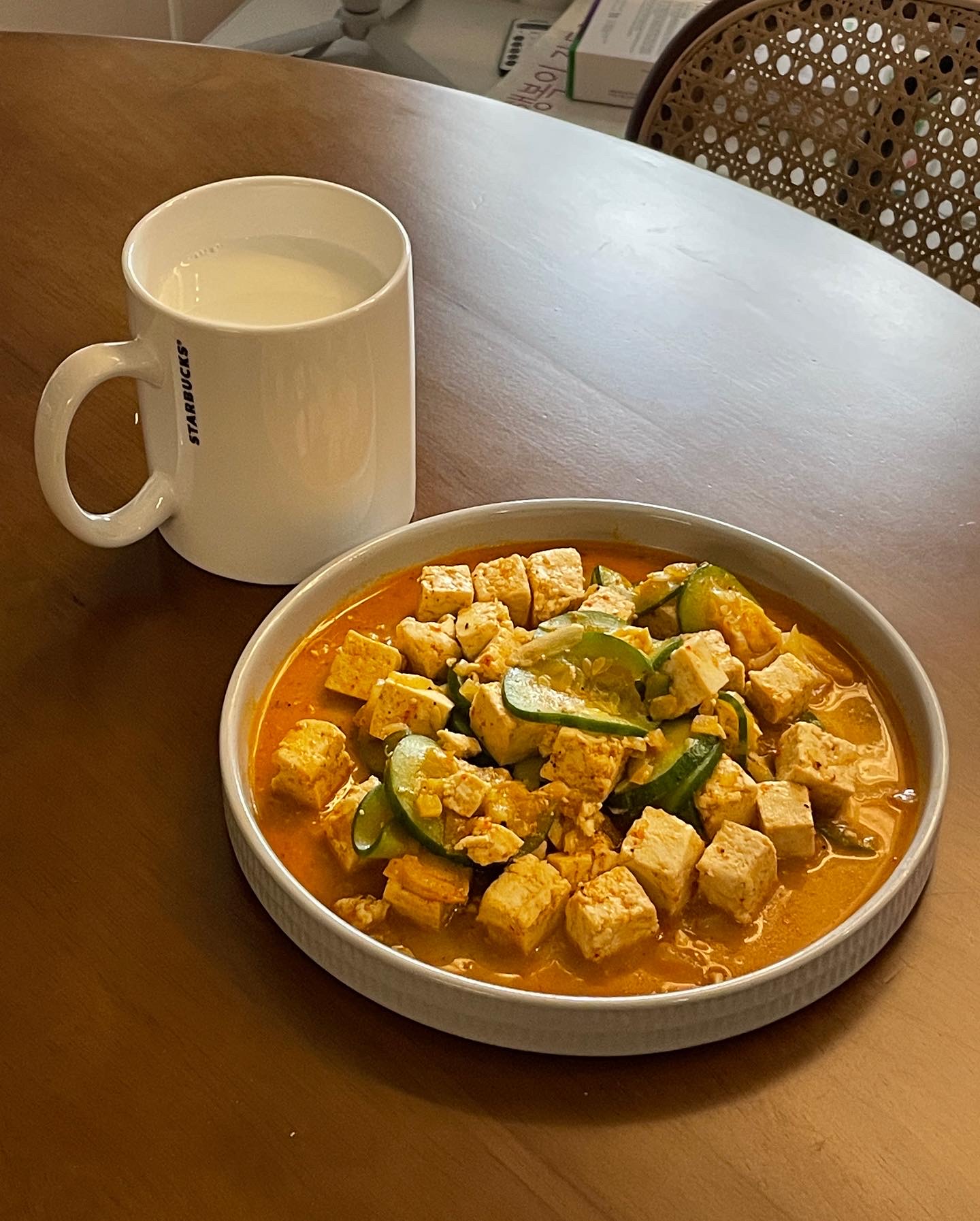 #저녁 - 두부애호박조림, 우유 한 잔 : 애호박은 그냥 얇게 저며서 익혔는데 푹 익히면 뭉개지는 식감 덕에 잘 먹을 수 있습니다. 볶은 애호박과 양파 등의 야채, 양념을 먹은 두부로 채워진 저녁, 밥 한 숟갈 하면 좋겠지만, 일단 쌀 먹는 식감이 불편해서 딱히 안 당기네요. 밥이 없다 보니 간은 정말 소소하게만 하고 있습니다 :)