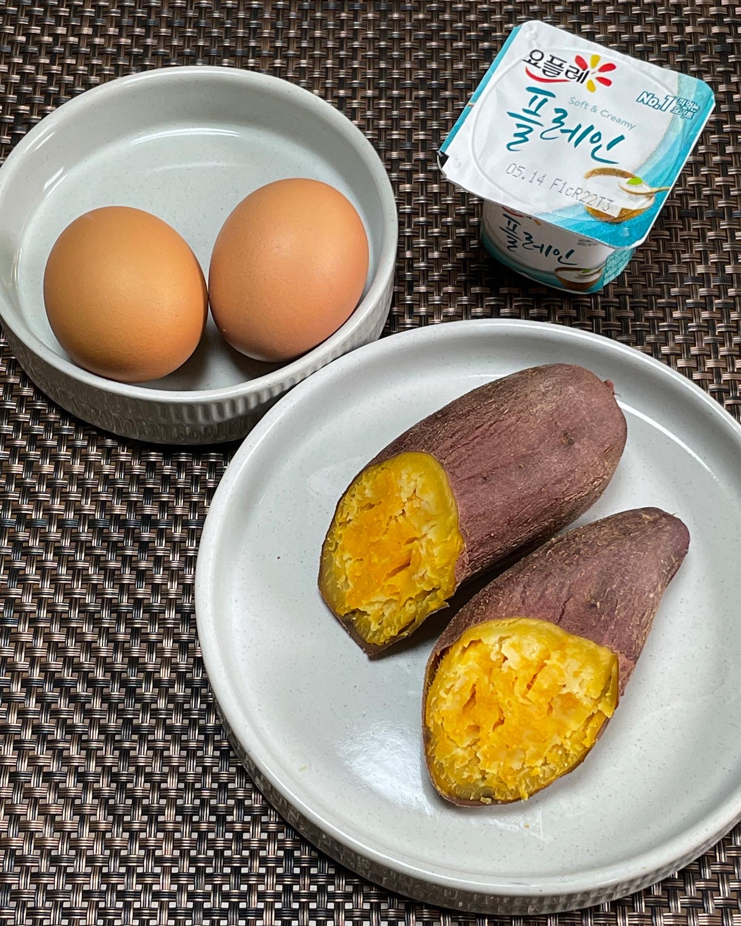 #아침 - 플레인요거트 1개, 찐 고구마 반쪽 2개, 계란 2개 : 첫날과 마찬가지 식사에, 플레인요거트까지! 양은 너무 적은 것 같다고 코치님이 그러셔서 일단 하나씩 더 늘려봤습니다. 그전까지 고구마를 좀 먹었어서 슬 물리는...